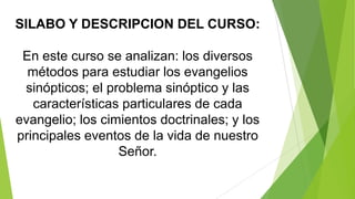 Este documento presenta un resumen del curso "Los evangelios sinópticos". El curso analiza los métodos para estudiar los evangelios de Mateo, Marcos y Lucas, el problema sinóptico y las características de cada evangelio. También examina los cimientos doctrinales y los principales eventos en la vida de Jesucristo según estos evangelios. El curso tiene como objetivos que los estudiantes conozcan y analicen estos aspectos de los evangelios sinópticos.