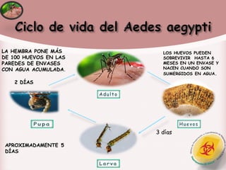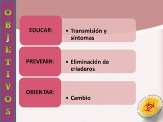 El documento aborda la transmisión, síntomas y prevención de tres enfermedades virales: dengue, chikungunya y zika, todas transmitidas por el mosquito Aedes aegypti. Ninguna de estas enfermedades tiene un tratamiento antiviral específico ni vacuna, y se enfatiza la importancia de la eliminación de criaderos de mosquitos y el uso de medidas de protección. Se destaca la necesidad de atención especial para grupos de alto riesgo, incluyendo infantes y mujeres embarazadas, debido a complicaciones como microcefalia y síndrome de Guillain-Barré.