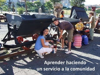 Este documento describe el aprendizaje-servicio (APS) como una herramienta educativa y social para los municipios. Explica que el APS une objetivos educativos y de ciudadanía al dar respuesta a necesidades reales de la comunidad. A continuación, ofrece recomendaciones para implementar el APS e ilustra el proceso con el ejemplo del municipio de L'Hospitalet de Llobregat y su proyecto "Jóvenes por el Barrio".