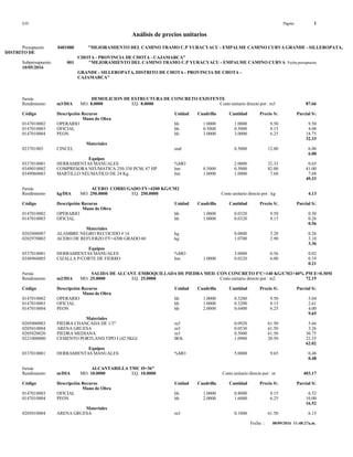 Este documento presenta un análisis de precios unitarios para el proyecto de mejoramiento de un camino en la provincia de Chota, Cajamarca. Incluye partidas como limpieza de terreno, trazo y replanteo, encofrado y desencofrado, relleno con material propio, demolición de estructuras de concreto, y construcción de alcantarillas y obras de concreto. Proporciona detalles sobre mano de obra, materiales, equipos y costos unitarios directos por unidad de cada partida.