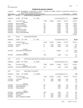 El documento presenta un presupuesto para el mejoramiento y ampliación de pistas y veredas en el barrio centro de Huachocolpa, que incluye partidas como señalización, equipo de protección, demolición de estructuras, corte de terreno, perfilado y compactado. Se describen los recursos, materiales, mano de obra y equipos necesarios para cada partida con sus respectivos costos unitarios.