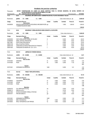 Este documento presenta un presupuesto para la construcción de un campo de césped sintético en el estadio municipal de Sayán, Perú. Incluye un análisis de precios unitarios con partidas para la caseta de guardianía, señalización, equipos de protección, seguridad en la obra, limpieza del terreno, trazo y replanteo, demolición de losa existente, eliminación de materiales, perfilado del sub-rasante, y construcción de la base granular con extendido, batido, riego y compactación.
