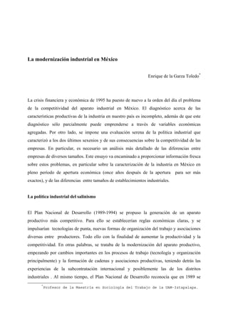 Este documento analiza la modernización industrial en México durante el periodo de apertura económica desde 1982 hasta 1994. Resume que la política industrial del gobierno de Salinas de Gortari se enfocó en la desregulación y eliminación de subsidios para inducir la competitividad, pero dedicó muy pocos recursos a la modernización. Además, aunque el crecimiento económico fue mayor en algunos años, la productividad industrial estuvo estancada y hubo pérdida de empleos manufactureros. Finalmente, analiza las diferencias en caracterí