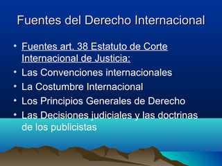 Este documento describe las principales fuentes y elementos del derecho internacional público. Resume las fuentes formales del derecho internacional según el Estatuto de la Corte Internacional de Justicia, incluyendo tratados internacionales, costumbre internacional, principios generales de derecho y decisiones judiciales. También cubre otros instrumentos como resoluciones de organismos internacionales y actos jurídicos unilaterales de los estados. Explica la clasificación, estructura, celebración y efectos de los tratados internacionales, así como las reservas, nulidad