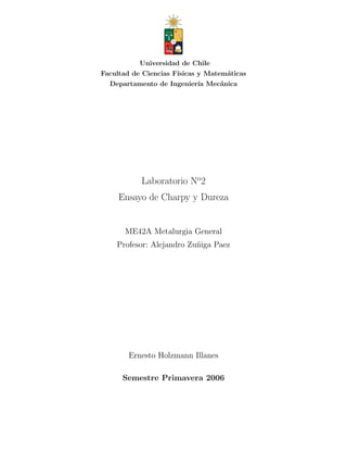El documento presenta información sobre los ensayos de Charpy y dureza. Explica que el ensayo de Charpy mide la energía absorbida por una probeta entallada cuando se rompe de un golpe, lo que permite determinar la temperatura de transición frágil-dúctil de un material. También describe los factores que influyen en la tenacidad de un material como la composición, tamaño de grano y estructura cristalina. Finalmente, introduce los conceptos de dureza y los métodos para medirla, como los ensayos de Br