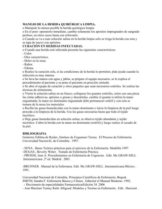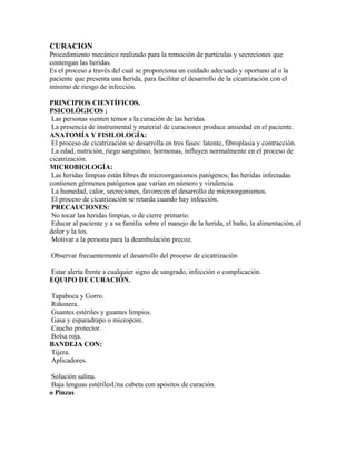 La curación es un procedimiento para remover partículas y secreciones de heridas para facilitar la cicatrización y prevenir infecciones. Involucra limpiar y cuidar la herida de manera apropiada considerando factores como la anatomía, fisiología, microbiología y psicología del paciente. Se debe observar el proceso de cicatrización, estar alerta a complicaciones e instruir al paciente sobre el cuidado de la herida.