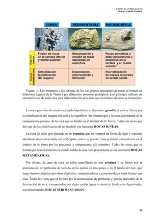 Este documento presenta una introducción a las rocas y describe los tres principales tipos: ígneas, metamórficas y sedimentarias. Explica que las rocas varían en su mineralogía, textura y composición química, lo que revela los procesos geológicos que las formaron. También describe el ciclo de las rocas, por el cual una roca puede transformarse en otro tipo a través de procesos como la erosión, transporte, sedimentación y metamorfismo. Finalmente, vincula estos procesos geológicos con