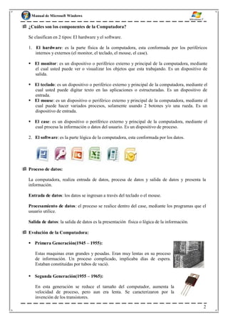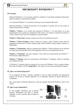 Este documento proporciona información sobre el sistema operativo Microsoft Windows 7. Explica que Windows 7 es la versión más reciente lanzada por Microsoft y que incluye mejoras sobre Windows Vista. También describe las diferentes versiones de Windows 7, como Professional, Home Premium, etc. y sus características principales. Además, explica conceptos básicos sobre computadoras como hardware, software, unidades de almacenamiento y otros componentes.