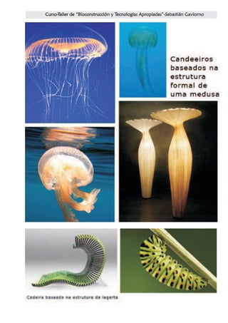 Este documento describe varias técnicas de bioconstrucción que utilizan materiales naturales como la tierra, piedra, madera y caña. Explica cómo la observación de patrones en la naturaleza puede inspirar el diseño orgánico de viviendas y cómo las técnicas tradicionales como el adobe, tapial y cob son efectivas y respetuosas con el medio ambiente. También presenta ejemplos de diseños innovadores como domos geodésicos, earthships y superadobe que demuestran formas sustentables de habitar en armonía