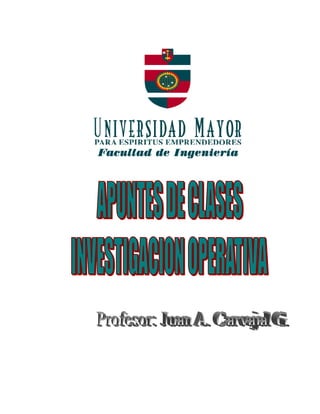 Este documento presenta apuntes de clases sobre Investigación de Operaciones impartida por el profesor Juan A. Carvajal G. En la introducción, se describe el programa de materias incluyendo temas como Programación Lineal, Aplicaciones Especiales de Programación Lineal y Modelos en Redes. Luego, se explican conceptos clave como marco de aplicación, métodos de toma de decisiones y fases de un estudio de Investigación de Operaciones. Finalmente, se detallan temas como modelación matemática, solución gráfica y algoritmo Simplex de Program
