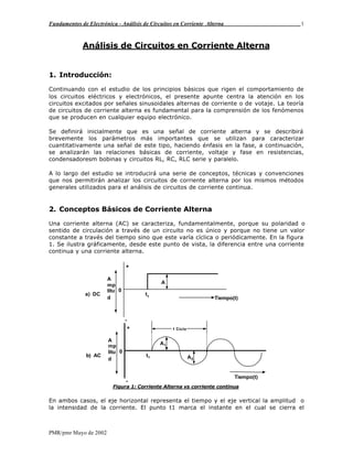Este documento introduce conceptos básicos sobre análisis de circuitos de corriente alterna. Define corriente alterna como una corriente que cambia periódicamente de polaridad con el tiempo, en contraste con la corriente continua que mantiene una polaridad constante. Explica parámetros clave como amplitud, frecuencia, fase y forma de onda, y cómo se pueden usar fasores para representar señales de corriente alterna.