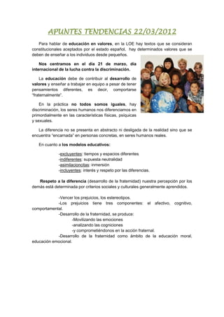 El documento habla sobre la educación en valores y la lucha contra la discriminación. Explica que la LOE establece valores que deben enseñarse a los estudiantes y que la educación debe promover el trabajo en equipo y respeto a pesar de las diferencias. También discute los modelos educativos excluyentes, indiferentes, asimilacionistas e incluyentes y la importancia de vencer prejuicios y estereotipos para desarrollar la fraternidad a través de las emociones, cogniciones y acción.