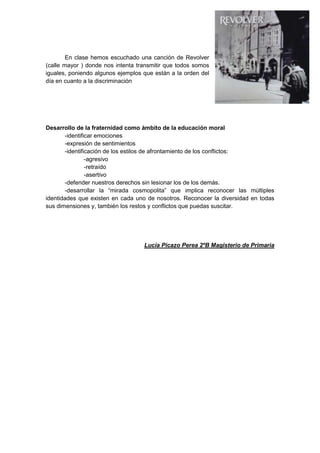 El documento habla sobre la educación en valores y la lucha contra la discriminación. Señala que la LOE establece valores que deben enseñarse a los estudiantes y que la educación debe promover el trabajo en equipo y respeto a pesar de las diferencias. También discute los modelos educativos excluyentes, indiferentes, asimilacionistas e inclusivos. Finalmente, enfatiza la importancia de vencer prejuicios, desarrollar la fraternidad a través de las emociones, cogniciones y acción, y reconocer la divers