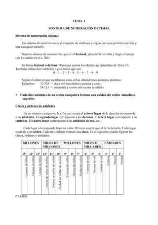 Este documento explica el sistema de numeración decimal y las operaciones básicas con números naturales. Primero define el sistema de numeración decimal y explica que usa 10 símbolos (0-9) y que el valor de cada cifra depende de su posición. Luego describe las cuatro operaciones básicas (suma, resta, multiplicación y división) con números naturales. Finalmente introduce los conceptos de múltiplos y divisores.
