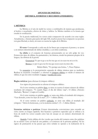 Este documento presenta apuntes sobre poética, incluyendo conceptos como métrica, estrofas, rima y recursos literarios. Explica las partes del verso como la sílaba y el ritmo acentual, y tipos de versos según su medida, rima y composición. También describe figuras métricas como la sinalefa y licencias poéticas. Finalmente, detalla varios tipos de estrofas populares como el terceto, cuarteto y redondilla según su estructura métrica y esquema de rima.