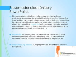 El documento proporciona información sobre presentadores electrónicos y PowerPoint. Explica que PowerPoint es un programa de presentaciones desarrollado por Microsoft y describe algunas de sus funciones básicas como trabajar con tablas, gráficos e insertar sonido. También menciona otros programas de presentaciones como OpenOffice Impress y Keynote.