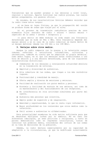 La radio se define como la transmisión pública de mensajes a larga distancia mediante ondas electromagnéticas. Puede realizarse a través de ondas o de Internet. Sus principales características son su propagación unidireccional, alta velocidad y que permite la audición prácticamente instantánea. Sus ventajas incluyen inmediatez, amplia cobertura, facilidad de uso, bajo costo de producción y adaptación a diferentes circunstancias. Sus funciones principales son informar y entretener, aunque también puede tener fines educativos