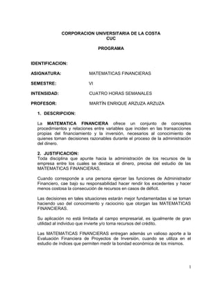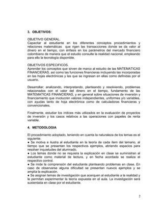 Este documento presenta el plan de estudios de la asignatura Matemáticas Financieras de una universidad. Describe los objetivos del curso, que incluyen capacitar a los estudiantes en conceptos y procedimientos matemáticos relacionados con transacciones financieras que involucran el valor del dinero en el tiempo. También presenta los temas a cubrir, como interés simple y compuesto, conversiones de tasas, series de tiempo y evaluación de proyectos de inversión. El curso utiliza métodos como explicación, resolución de problemas y uso de hojas