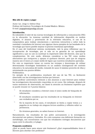 El documento presenta una propuesta académica para abordar problemas comunes que surgen cuando los estudiantes realizan investigaciones utilizando Internet, como considerar a Internet como la única fuente de información, asumir que toda la información en Internet es válida, y limitarse a copiar y pegar textos sin análisis. La propuesta incluye sugerencias como plantear tareas de investigación de manera más abierta y creativa, requerir el uso de diferentes fuentes de información, y enseñar a los estudiantes habilidades básicas de b
