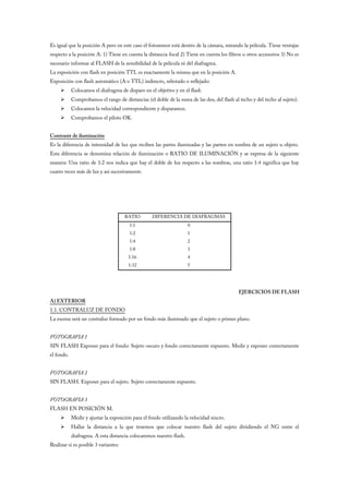 Este documento proporciona instrucciones sobre el uso de flashes externos para retratos, incluyendo la ley inversa del cuadrado, cálculo del número guía, velocidad de sincronización, duración del destello, y métodos manuales, automáticos y con flash indirecto. También incluye ejercicios prácticos de flash exterior e interior, así como técnicas de pintado con flash.
