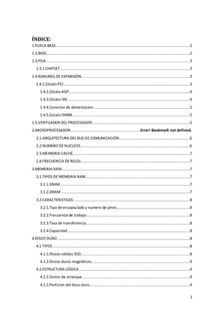 Este documento describe los principales componentes de un ordenador. Explica la placa base, el microprocesador, la memoria RAM, el disco duro y los periféricos. Detalla cada uno de estos elementos, sus características y funciones clave en 1 o 2 oraciones.