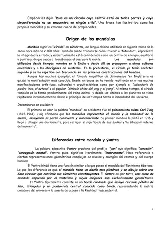El documento explica qué es un mandala, su origen y significado. Un mandala es un círculo sagrado que representa la totalidad y la verdad. Se usa en la meditación y el arte para curar la mente y el espíritu. Los mandalas tienen formas geométricas como círculos, cuadrados y triángulos con colores que simbolizan estados de ánimo y energías. El documento describe cómo dibujar un mandala y sus beneficios terapéuticos y espirituales.