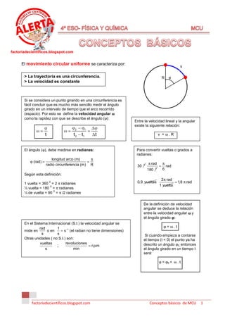 Este documento explica conceptos básicos del movimiento circular uniforme, incluyendo que la velocidad es constante y la trayectoria es una circunferencia. Define la velocidad angular como la rapidez con que se describe el ángulo y la relación entre velocidad lineal y angular. Explica cómo medir ángulos en radianes y la relación entre periodo, frecuencia y velocidad angular. Resuelve ejemplos de cálculos relacionados con estas definiciones.