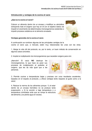 Este documento proporciona una introducción a la técnica culinaria de la cocina al vacío. Explica los principios básicos de esta técnica, incluyendo los tipos de vacío, utensilios y envases comúnmente utilizados, así como las ventajas y usos más frecuentes de la cocina al vacío como la conservación, la cocción y la organización en la cocina. También destaca la importancia de la higiene y la seguridad al trabajar con esta técnica.