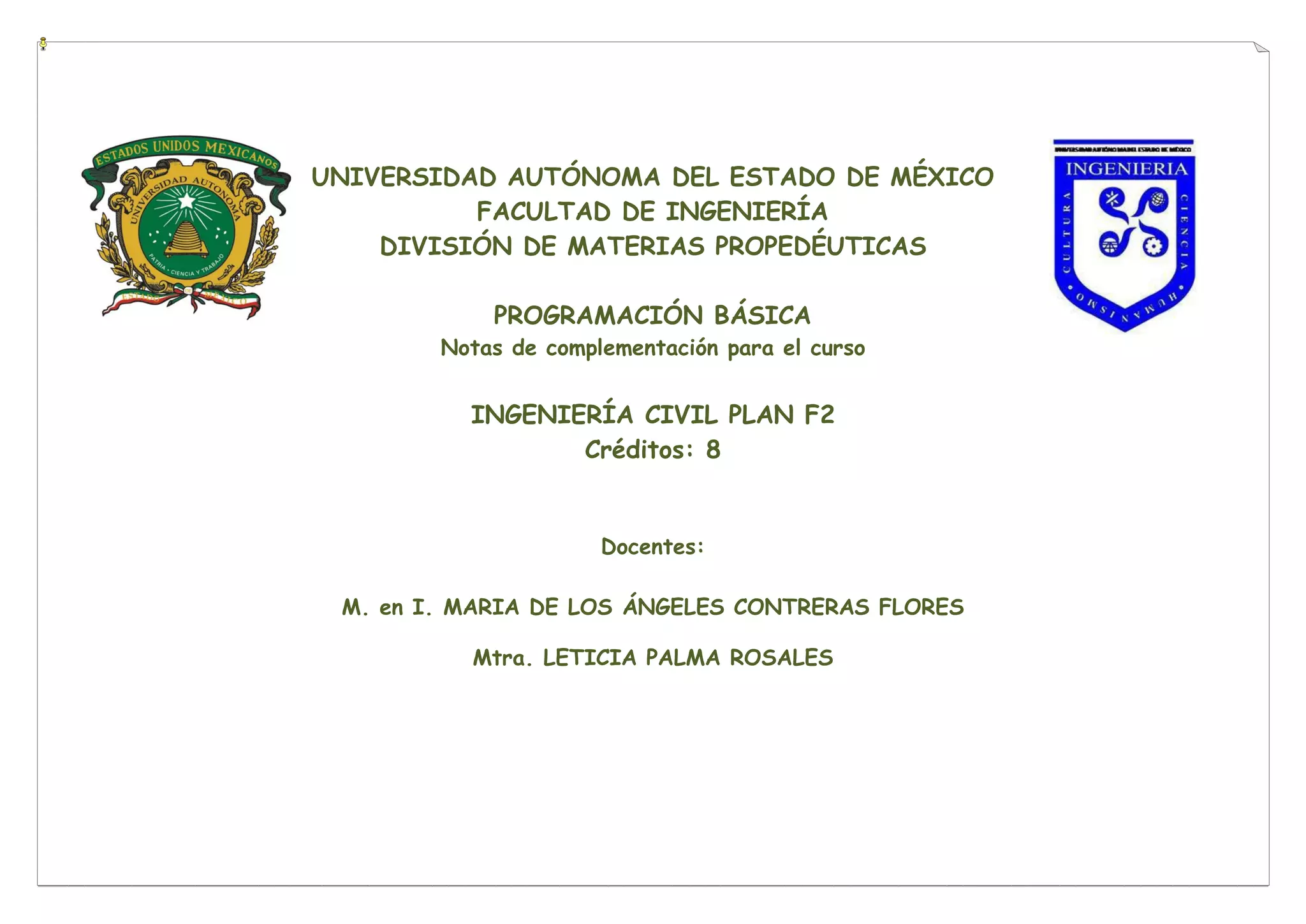 Este documento presenta notas de complementación para el curso de programación básica para ingeniería civil. Contiene cuatro unidades que cubren definiciones básicas, estructuras de control, vectores y matrices, y funciones. La introducción describe el objetivo de apoyar a los estudiantes para reforzar los conocimientos adquiridos en clase.
