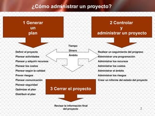 El documento habla sobre la administración de proyectos. Explica que involucra planear, organizar y controlar tareas y recursos para alcanzar objetivos dentro de límites de tiempo, costo y alcance. Describe las fases de un proyecto como crear el plan, administrar y dar seguimiento, y cerrar el proyecto. También explica conceptos clave como objetivos, suposiciones, límites y dependencias entre tareas.