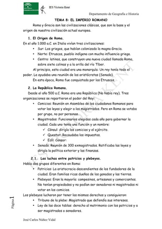 El documento resume la historia del Imperio Romano desde sus orígenes en Roma hasta su expansión y organización interna. Roma comenzó como una monarquía que luego se convirtió en república, expandiéndose para conquistar gran parte de Europa y el Mediterráneo. Más tarde, el Imperio Romano se estableció bajo el emperador Octavio Augusto, adoptando una estructura provincial gobernada por el emperador y el senado. El imperio floreció debido a su agricultura, comercio y cultura, aunque eventual