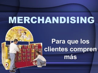 El documento habla sobre el merchandising como una forma de mercadeo que busca persuadir a los clientes a comprar más en el lugar de compra a través de exhibiciones y publicidad. Recomienda que las empresas usen el merchandising en épocas de mayor venta como Navidad, Día de la Madre, etc. y que exhiban de manera atractiva los productos más populares, ofertas y novedades para atraer a nuevos clientes.