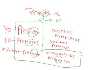 El documento presenta ejemplos de cómo cambiar verbos en español para expresar diferentes tiempos y modos. Muestra las terminaciones "-er" e "-ie" que se añaden a los verbos para formar el futuro y el condicional, respectivamente. También incluye oraciones incompletas para practicar el uso de verbos como "preferir", "querer" y "pensar" en diferentes tiempos y modos.