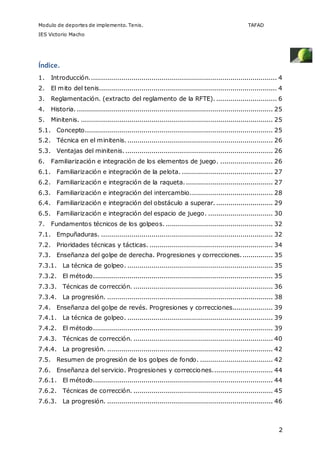 Este documento presenta un módulo sobre la enseñanza del tenis. Incluye la reglamentación del tenis con detalles sobre las dimensiones de la cancha y la red. También cubre conceptos básicos sobre la historia y técnicas del tenis como saques, golpes y tácticas. El objetivo es proporcionar una guía para la enseñanza efectiva del tenis.