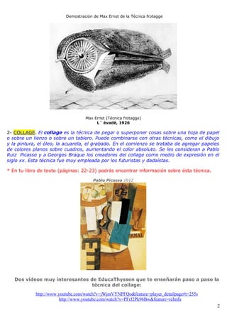El documento describe diferentes técnicas para crear texturas en arte, incluyendo frottage, collage, esgrafiado, estarcido, estampación, monotipo y pintura flotante. Explica cómo cada técnica se puede usar con diferentes materiales como lápices, ceras, pintura y plantillas para lograr efectos de textura únicos. Alienta al lector a experimentar con estas técnicas y crear una colección de muestras de textura sobre papel.