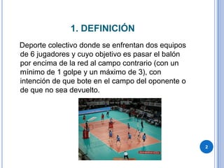 El documento resume el origen y las reglas básicas del voleibol. El voleibol fue creado en 1895 por William G. Morgan como un juego de entretenimiento para su programa de educación física. Las reglas se fueron estandarizando en las décadas siguientes y el voleibol se convirtió en un deporte olímpico en 1964. El juego se juega entre dos equipos de 6 jugadores cada uno separados por una red, con el objetivo de pasar el balón al campo contrario sin que toque el suelo.