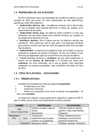 Este documento trata sobre los plásticos. Explica que los plásticos son materiales sintéticos obtenidos principalmente del petróleo, formados por largas cadenas de moléculas. Describe los principales tipos de plásticos como los termoplásticos, termoestables y elastómeros, y sus aplicaciones. También resume los principales métodos para procesar y fabricar objetos de plástico, como la inyección, extrusión y soplado. Por último, resalta la importancia del reciclaje de