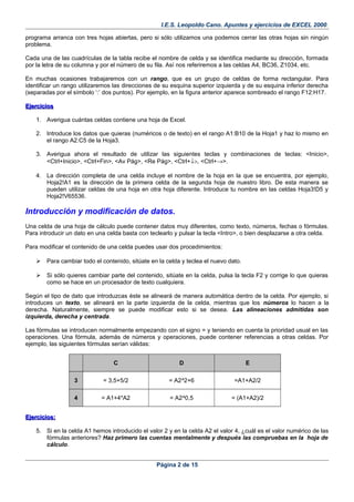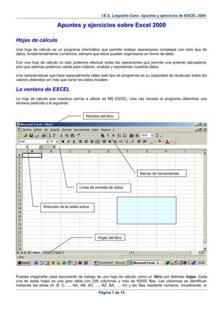 Este documento proporciona instrucciones y ejercicios sobre el uso de Microsoft Excel. Explica las características básicas de las hojas de cálculo de Excel, incluidas las celdas, hojas, funciones y fórmulas. Luego presenta una serie de 21 ejercicios para practicar el ingreso y manipulación de datos, la selección y copia de rangos, el uso de funciones como SUM y SERIES, y la copia de fórmulas con referencias absolutas y relativas. El objetivo general es familiarizar al lector con las principales