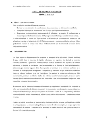 1) El documento presenta apuntes sobre mecánica de fluidos en tuberías. 2) Explica conceptos como flujo laminar, turbulento y transitorio, así como fórmulas para calcular caudal, velocidad y pérdida de carga. 3) Incluye secciones sobre objetivos del curso, introducción a flujos en tuberías, flujo laminar, determinación de caudal laminar, y pérdida de carga para flujo laminar.