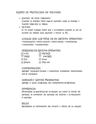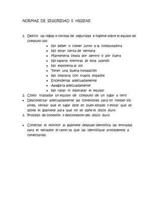 El documento presenta las normas de seguridad e higiene para el equipo de computo, incluyendo no comer o beber cerca de la computadora, mantenerla limpia y no exponerla al sol. También describe cómo conectar y desconectar dispositivos como el disco duro, monitor, teclado y ratón de forma segura. Finalmente, explica los tipos de sistemas operativos, como Windows, Mac OS y UNIX, y sus funciones para administrar hardware, software y recursos.