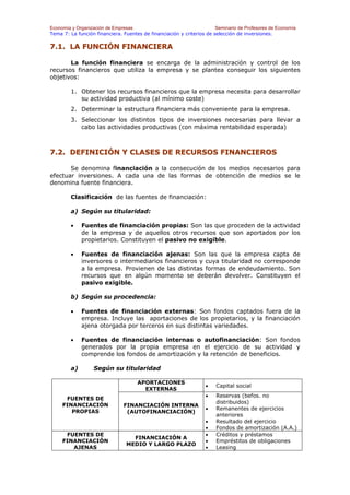 El documento describe la función financiera de las empresas y las fuentes de financiación. La función financiera se encarga de administrar los recursos financieros y seleccionar inversiones rentables. Las fuentes de financiación incluyen recursos propios como beneficios retenidos y recursos ajenos como préstamos y emisión de acciones. La empresa evalúa proyectos de inversión usando métodos estáticos como el plazo de recuperación y métodos dinámicos como el valor actual neto para seleccionar las inversiones más rentables.