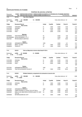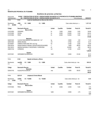 Este documento presenta un presupuesto para la construcción de pistas y veredas en el barrio San Martín Alto en la provincia de Utcubamba, Amazonas. Incluye un análisis de precios unitarios con partidas para actividades como limpieza de terreno, trazo y replanteo, corte de terreno con maquinaria, mejoramiento de subrasante, construcción de base granular e instalación de losa de rodadura y concreto en uñas.