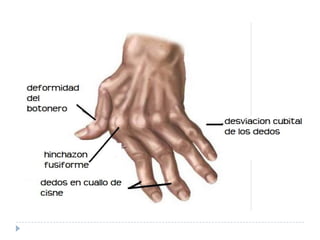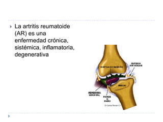 La artritis reumatoide (AR) es una enfermedad inflamatoria crónica que afecta principalmente las articulaciones periféricas de manera simétrica, causando dolor, hinchazón e inflamación. La AR se caracteriza por la inflamación de la membrana sinovial y la destrucción progresiva del cartílago y el hueso subyacente. Además de las manifestaciones articulares, la AR puede causar síntomas en otros órganos. No existe cura para la AR, pero el tratamiento temprano y agres