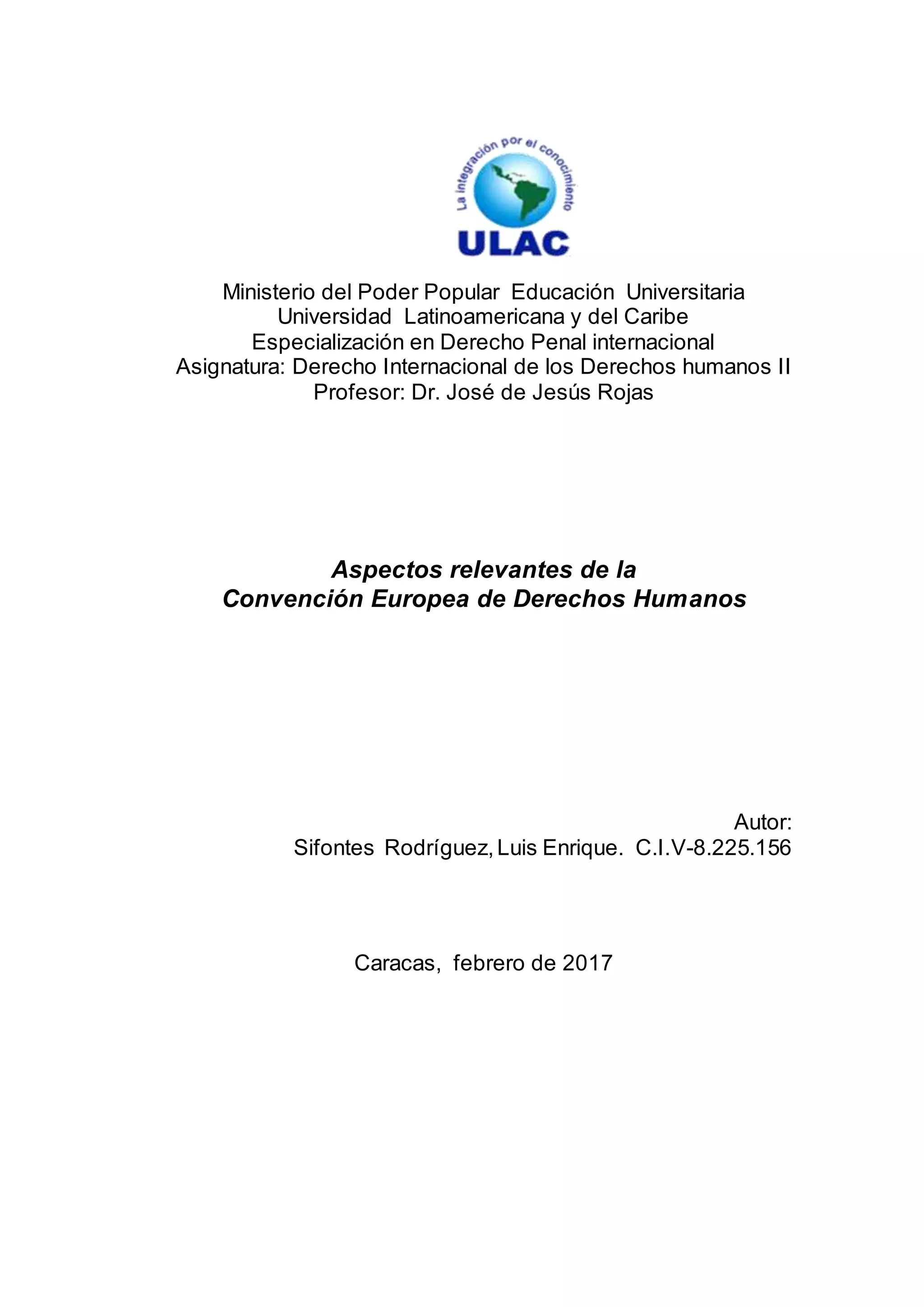 El documento resume los aspectos más relevantes de la Convención Europea de Derechos Humanos, incluyendo su creación en 1950 para proteger los derechos humanos en Europa luego de la Segunda Guerra Mundial. Explica que la Convención ha sido modificada por 16 protocolos adicionales para ampliar la lista de derechos protegidos y mejorar el sistema de protección. También describe los dos órganos creados para hacer cumplir la Convención: el Tribunal Europeo de Derechos Humanos y la antigua Comisión Europea de Derech