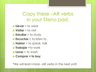 Este documento explica los verbos en español que terminan en -AR. Presenta 8 verbos comunes como "llevar", "visitar" y "estudiar" y enseña cómo conjugarlos agregando las terminaciones apropiadas para el sujeto. También explica los pasos para conjugar cualquier verbo -AR: identificar la raíz, encontrar el sujeto, y agregar la terminación correspondiente. Finalmente, da ejemplos para que el estudiante practique conjugar diferentes verbos -AR.