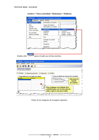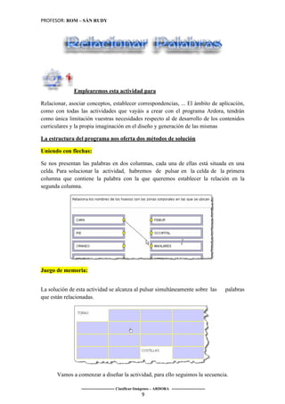 Este documento describe cómo crear una actividad de relacionar palabras usando el programa Ardora. Explica que la actividad permite relacionar conceptos uniendo palabras con flechas o haciendo clic simultáneamente en palabras relacionadas. Además, guía al lector a través de los pasos para diseñar, guardar y publicar la actividad.