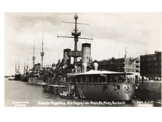 El documento presenta una lista cronológica de buques de la Armada Argentina entre 1880 y 1927, incluyendo acorazados, cruceros acorazados, cruceros, arietes torpederos y otros tipos de buques, con sus fechas de servicio. La lista contiene información básica como el nombre y tipo de cada buque así como las fechas entre las que estuvieron en servicio.