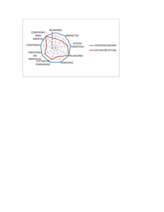 El documento habla sobre la importancia de las reuniones, proyectos, acceso a la experiencia y relaciones de otros para cultivar una comunidad y participación individual. También menciona conversaciones abiertas y la situación actual versus la deseada.