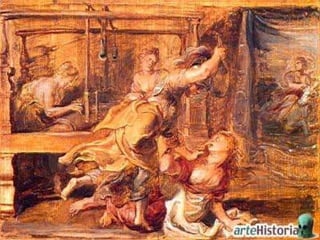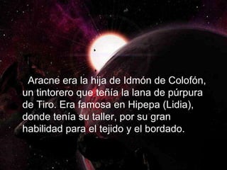 Aracne, una hábil tejedora de Lidia, se jactó de que sus habilidades superaban a las de la diosa Minerva. Minerva la retó a un concurso de tejido donde representaron escenas de la victoria de Minerva sobre Neptuno y las infidelidades de los dioses. Aunque admitió que la obra de Aracne era perfecta, Minerva se enfadó por su elección e irrespeto, destruyó su telar y la golpeó, transformándola en la primera araña.