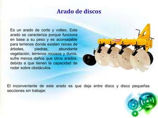 Este documento describe un arado de discos, incluyendo sus características, partes y ventajas. Un arado de discos funciona mediante su peso para cortar y voltear la tierra. Está compuesto de una serie de discos inclinados montados en un bastidor, cada disco gira independientemente para trabajar la tierra dejando pequeñas secciones sin trabajar entre ellos. Las principales partes son los discos, un rascador en cada disco, una rueda trasera y un bastidor al que se acoplan los demás componentes a través de bra